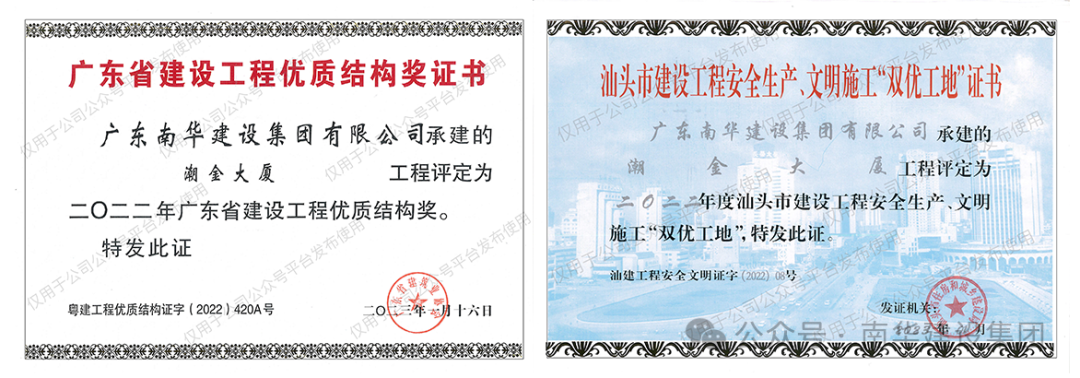 项目建设过程受到多个有关部门的好评,目前项目已获广东省建筑业协会授予2022年“广东省建设工程优质结构奖”、汕头市住房和城乡建设局授予2022年度汕头市建设工程安全生产、文明施工“双优工地”。