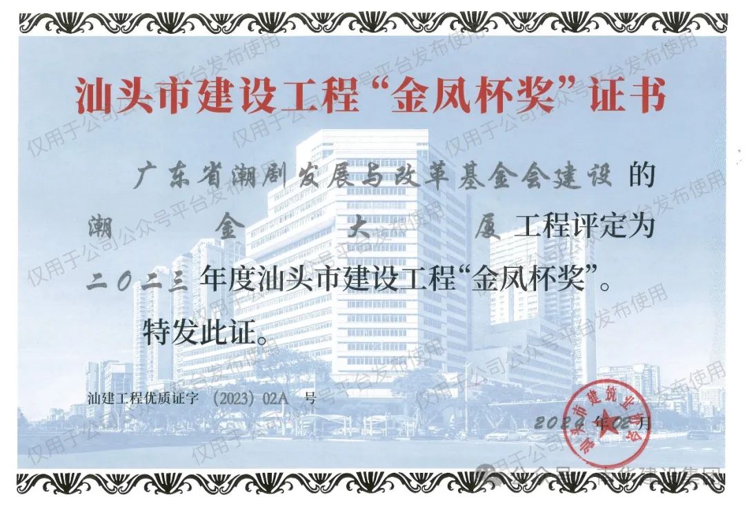 近日,由广东省潮剧发展与改革基金会兴建,广东南华建设集团有限公司投资并承建的潮金大厦荣获“汕头市建设工程金凤杯奖“。“金凤杯奖”是由汕头市颁发的优质工程奖项,由汕头市建筑业协会组织评选,旨在表彰建筑质量、工程管理、技术创新等方面表现突出的工程项目。